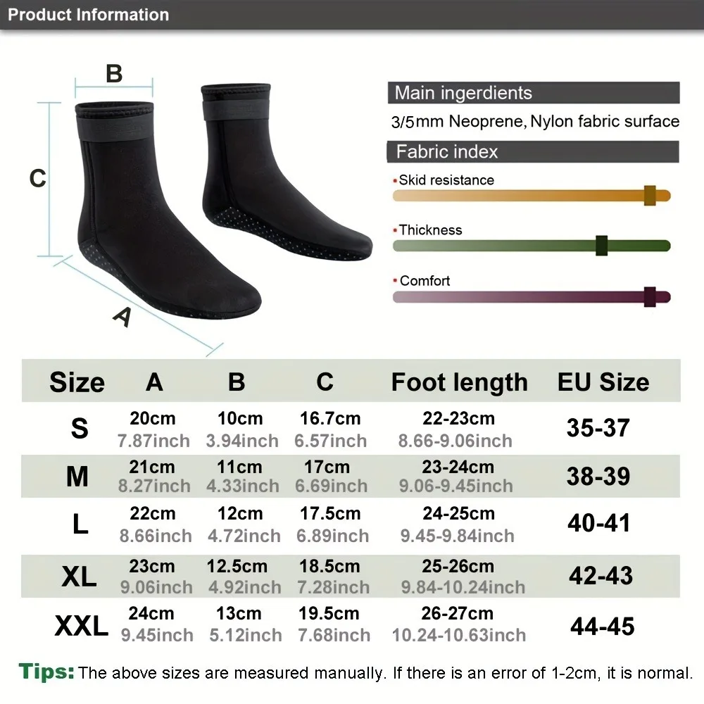 Stay warm, safe, and comfortable in the water with these 3mm neoprene diving socks, designed for snorkeling, surfing, swimming, and a variety of water sports. Crafted from high-elastic neoprene, they provide excellent flexibility while maintaining a snug fit that keeps your feet warm and protected. The non-slip sole enhances grip on wet, slippery surfaces, giving you greater safety and confidence on rocks, beaches, or boat decks. Perfect for wearing with or without fins, these socks reduce friction and prevent blisters during extended swimming or diving sessions. Their durable, sand-proof construction makes them ideal for both pool and ocean use, while reinforced stitching ensures long-lasting performance. Lightweight and easy to carry, they are perfect for beach trips, vacations, and regular water training. Whether snorkeling in shallow reefs, surfing waves, or swimming laps, these aqua socks deliver warmth, comfort, and reliable protection.