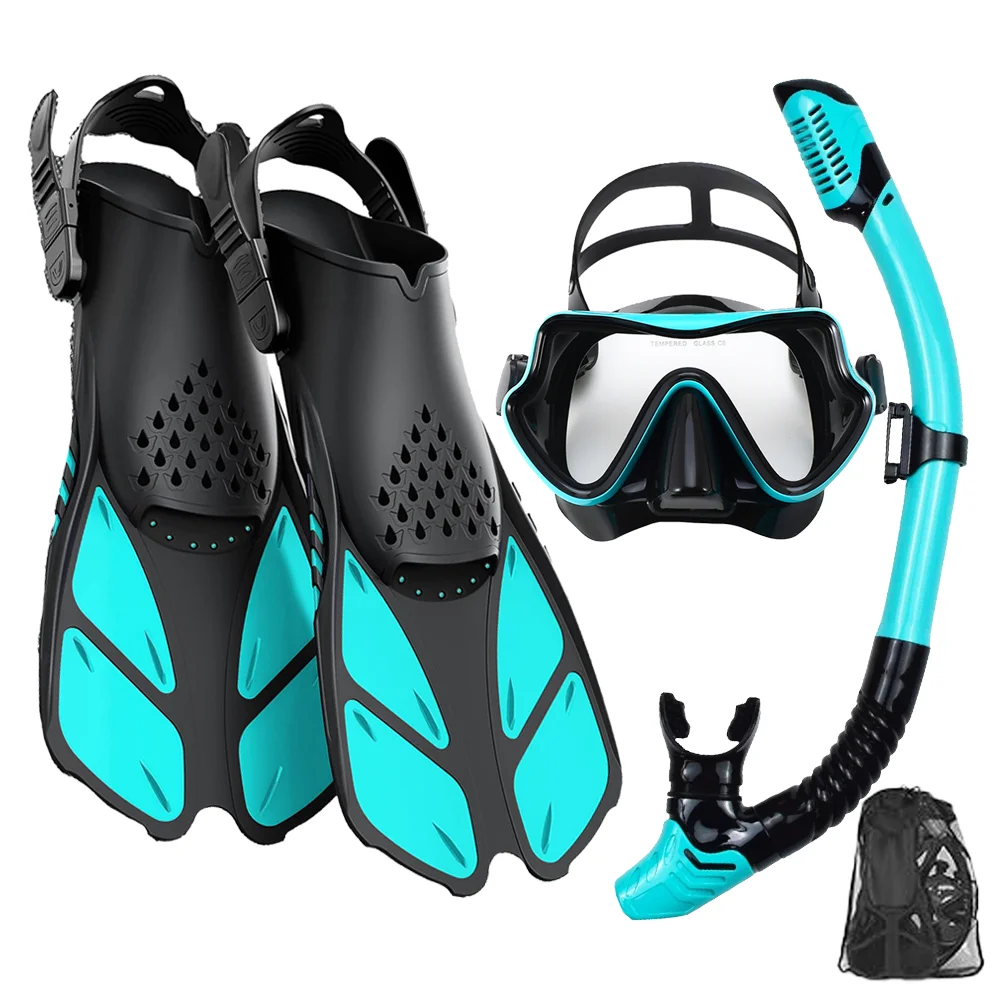 Get everything you need for underwater exploration with this complete adult mask, fins, and snorkel set, designed for comfort, clarity, and performance. The panoramic view snorkel mask features an anti-fog tempered glass lens, giving you a wide, crystal-clear perspective of the underwater world. A soft silicone skirt ensures a leak-proof fit, while adjustable straps provide all-day comfort. The dry-top snorkel prevents water from entering the tube, allowing smooth, natural breathing during snorkeling sessions. Paired with adjustable dive fins, this set enhances propulsion and control, reducing effort while swimming in both shallow and deeper waters. Lightweight yet durable, the set is perfect for beach trips, vacations, and training. Whether you’re snorkeling for fun, swimming for fitness, or exploring reefs, this professional-grade kit ensures safety, efficiency, and unforgettable aquatic adventures.